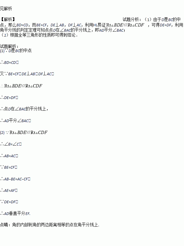 如图,在△ABC中,D是BC的中点,DE⊥AB于E,DF⊥AC于F,BE=CF.