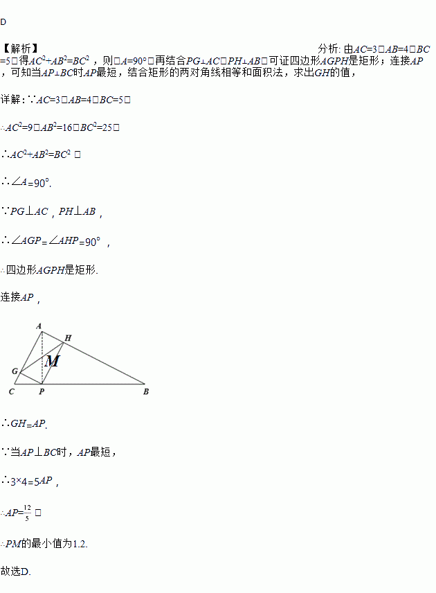 如图, 在△ABC中,AC=3、AB=4、BC=5, P为BC上一动点,PG⊥AC于点G,PH⊥AB