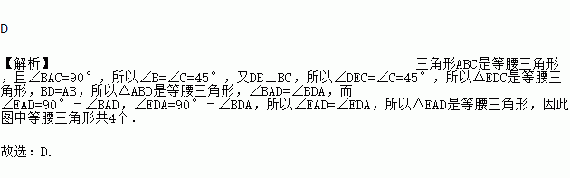 D 【解析】三角形ABC是等腰三角形,且∠BAC=90°,所以∠B=∠C=45°,又DE⊥BC,所以∠DEC=∠C=45°,所以△EDC是等腰三角形,BD=AB,所以△ABD是等腰三角形,∠BAD=∠BDA,而∠EAD=90°﹣∠BAD,∠EDA=90°﹣∠BDA,所以∠EAD=∠EDA,所以△EAD是等腰三角形,因此图中等腰三角形共4个. 故选:D.