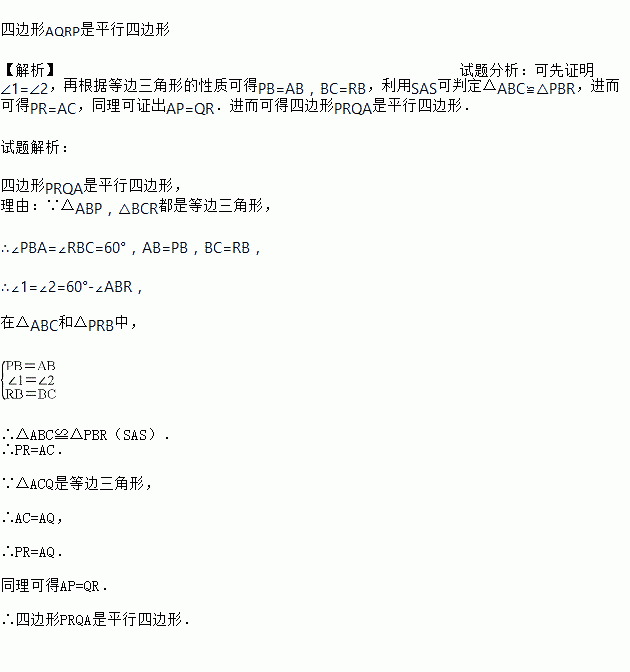 如图,以△ABC的三边为边在BC的同一侧作等边△ABP,等边△ACQ,等边△BCR,那么四边形AQRP是平行四边形吗?若是,请证明;若不是,请说明理由.