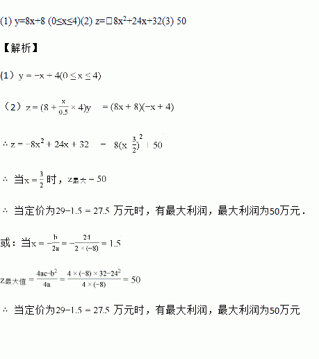 (2) 假设这种汽车平均每周的销售利润为z万元,试写出z与x之间的函数关系式;
