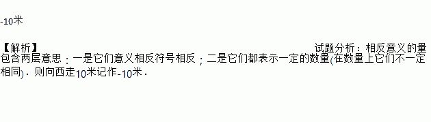 -10米 【解析】试题分析:相反意义的量包含两层意思:一是它们意义相反符号相反;二是它们都表示一定的数量(在数量上它们不一定相同).则向西走10米记作-10米.