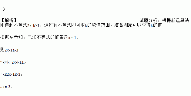 在实数范围内规定新运算“△”,其规则是:a△b=2a-b.已知不等式x△k≥1的解集表示在数轴上如图所示,则k的值是__________.