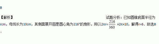 如图,圆锥底面半径为rcm,母线长为10cm,其侧面展开图是圆心角为216°的扇形,则r的值为( )