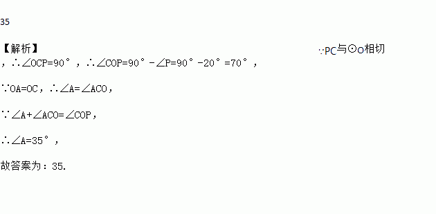 如图,P是⊙O的直径AB延长线上的一点,PC与⊙O相切于点C,若∠P=20°,则∠A=________°.