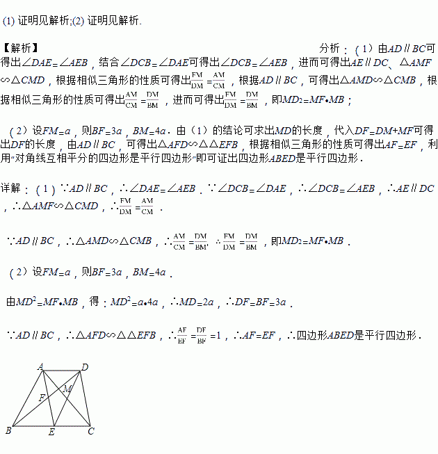如图,在梯形ABCD中,AD∥BC,对角线 AC、BD交于点 M,点E在边BC上,且∠DAE=∠DCB,联结AE,AE与BD交于点F.