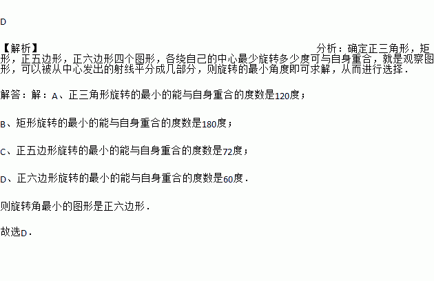 D 【解析】分析:确定正三角形,矩形,正五边形,正六边形四个图形,各绕自己的中心最少旋转多少度可与自身重合,就是观察图形,可以被从中心发出的射线平分成几部分,则旋转的最小角度即可求解,从而进行选择. 解答:【解析】 A、正三角形旋转的最小的能与自身重合的度数是120度; B、矩形旋转的最小的能与自身重合的度数是180度; C、正五边形旋转的最小的能与自身重合的度数是72度...