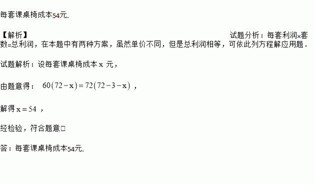 每套课桌椅成本54元. 【解析】试题分析:每套利润×套数=总利润,在本题中有两种方案,虽然单价不同,但是总利润相等,可依此列方程解应用题. 试题解析:设每套课桌椅成本元, 由题意得: , 解得, 经检验,符合题意, 答:每套课桌椅成本54元.