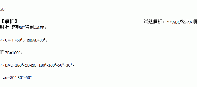 如图,△ABC绕点A顺时针旋转80°得到△AEF,若∠B=100°,∠F=50°,则∠α的度数是________.