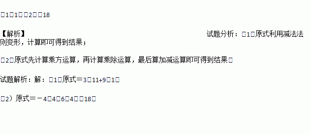 计算下列各式:(1)3+(-11)-(-9);(2)-22-(-2)2+(-3)2×(-)-42÷|-4|