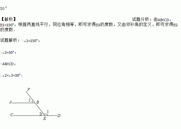 如图,已知AB∥CD,∠1=150°,则∠2=_____.
