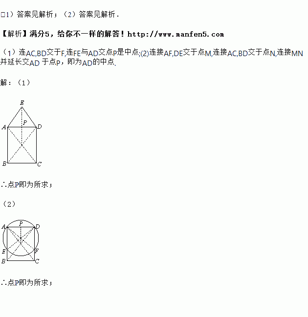 (2)如图2,已知四边形ABCD为矩形,经过A、D两点的圆分别与AB、CD相交于点E、F,请你用无刻度的直尺找出AD的中点P.