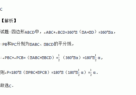 如图,在四边形ABCD中,∠A+∠D=α,∠ABC的平分线与∠BCD的平分线交于点P,则∠P=( )