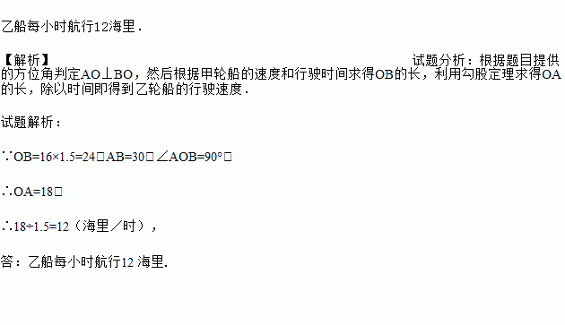 如图,甲船以16海里/时的速度离开港口,向东南航行,乙船在同时同地向西南方向航行,已知他们离开港口一个半小时后分别到达B、A两点,且知AB=30海里,问乙船每小时航行多少海里?