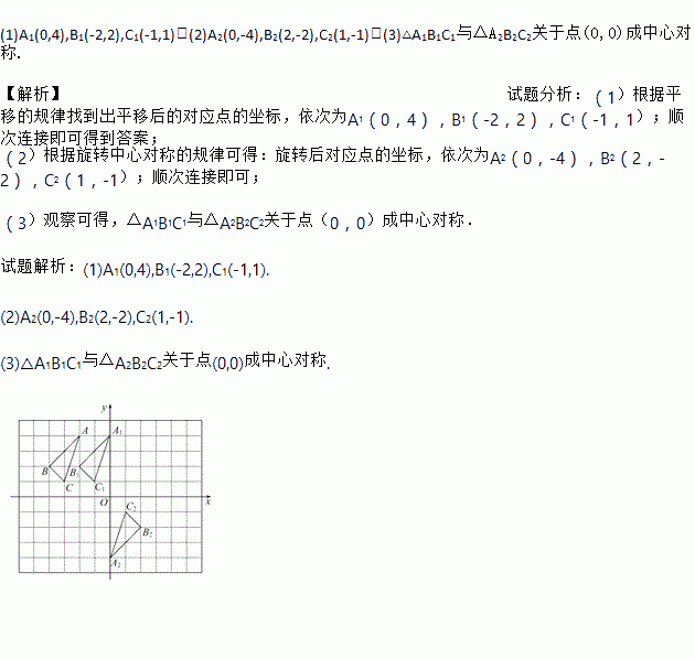 (3)观察△A1B1C1和△A2B2C2,它们是否关于某点成中心对称?若是,请写出对称中心的坐标;若不是,说明理由.