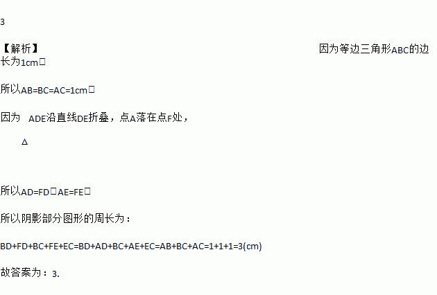 如图,等边△ABC的边长为1cm,D、E分别是AB、AC上的点,将△ADE沿直线DE折叠,点A落在点A′处,且点A′在△ABC外部,则阴影部分图形的周长为_______cm.
