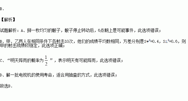 B.甲、乙两人在相同条件下各射击10次,他们的成绩平均数相同,方差分别是S甲2=0.4,S乙2=0.6,则甲的射击成绩较稳定
