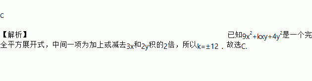 C 【解析】已知9x2+kxy+4y2是一个完全平方展开式,中间一项为加上或减去3x和2y积的2倍,所以k=±12.故选C.