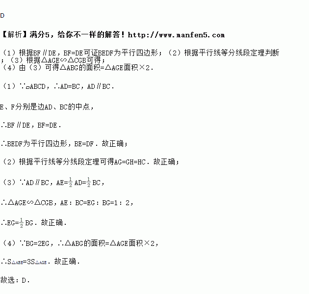 已知:如图,在?ABCD中,E、F分别是边AD、BC的中点,AC分别交BE、DF于C、H.请判断下列结论:(1)BE=DF;(2)AG=GH=HC;(3)EG=