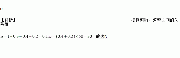 为了解小学生的体能情况,抽取了某小学同年级50名学生进行1分钟跳绳测试,将所得数据整理后,画出如图所示的频数分布直方图(各组只含最小值,不含最大值).已知图中从左到右各组的频率分别是a,0.3,0.4,0.2,设跳绳次数不低于100次的学生有b人,则a,b的值分别是( )