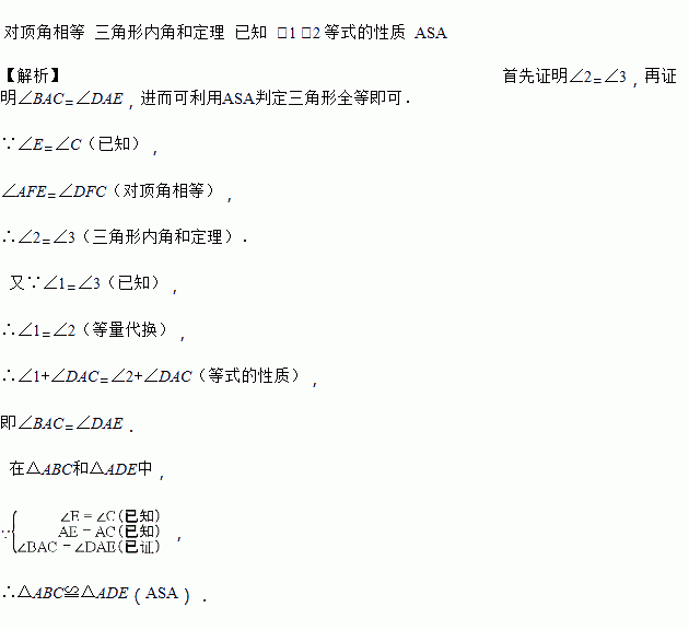 如图所示,点E在△ABC外部,点D在BC边上,DE交AC于F,若∠1=∠3,∠E=∠C,AE=AC,求证:△ABC≌△ADE.