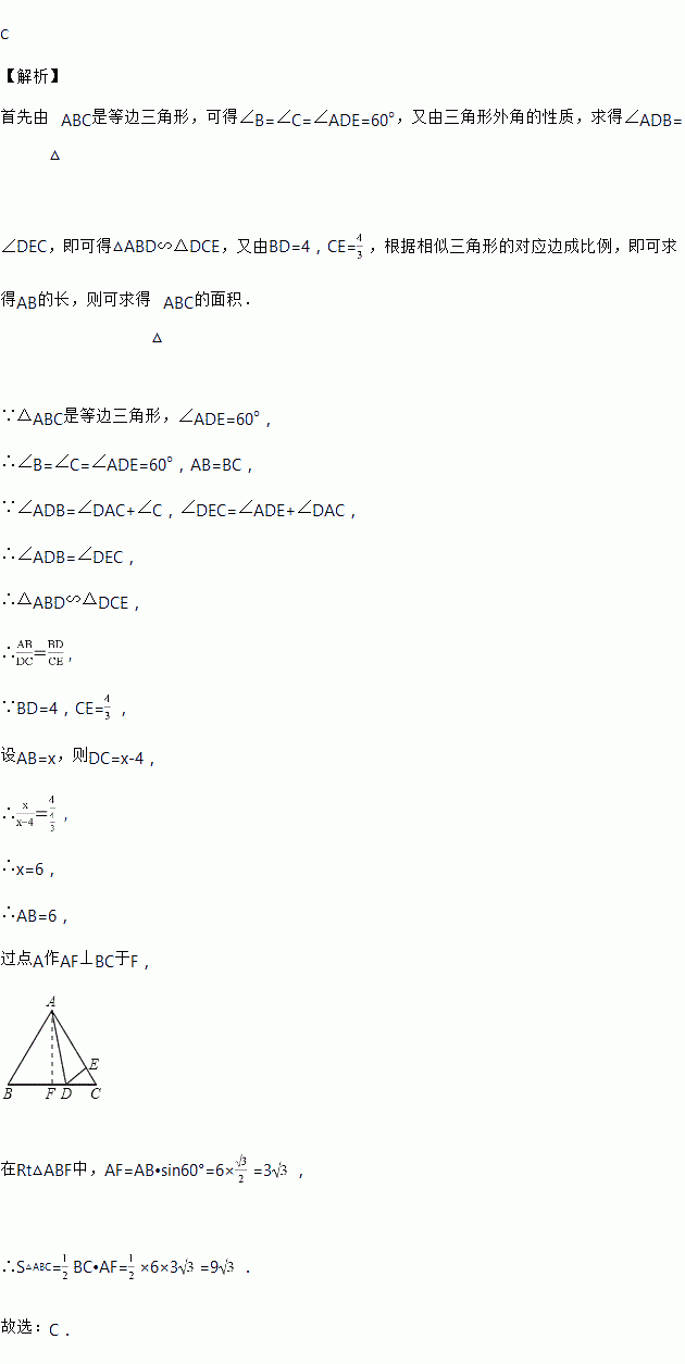 如图,在等边△ABC中,D为BC边上一点,E为AC边上一点,且 ∠ADE=60°,BD=4,CE=,则△ABC的面积 为( )