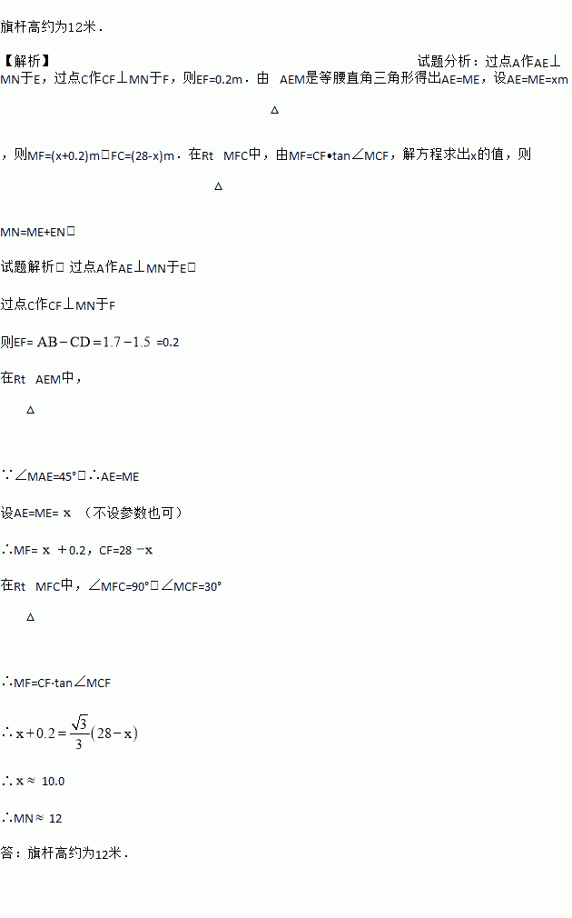 如图,在活动课上,小明和小红合作用一副三角板来测量学校旗杆高度.已知小明的眼睛与地面的距离(AB)是1.7m,他调整自己的位置,设法使得三角板的一条直角边保持水平,且斜边与旗杆顶端M在同一条直线上,测得旗杆顶端M仰角为45°;小红的眼睛与地面的距离(CD)是1.5m,用同样的方法测得旗杆顶端M的仰角为30°.两人相距28米且位于旗杆两侧(点B、N、D在同一条直线上).求出旗杆MN的高度.(参考数据:
