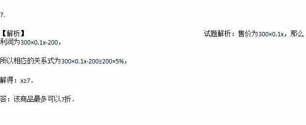 某商品进价200元,标价300元,商场规定可以打折销售,但其利润不能低于5%,该商品最多可以 折.