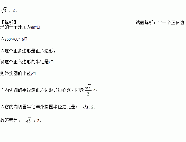 若一个正多边形的一个外角为60°,则它的内切圆半径与外接圆半径之比是 ____ .