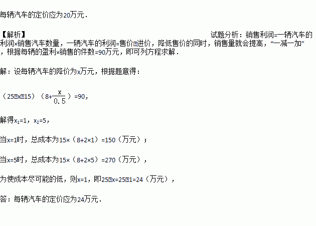 某汽车4S店销售某种型号的汽车,每辆进货价为15万元,该店经过一段时间的市场调研发现:当销售价为25万元时,平均每周能售出8辆,而当销售价每降低0.5万元时,平均每周能多售出1辆.该4S店要想平均每周的销售利润为90万元,并且使成本尽可能的低,则每辆汽车的定价应为多少万元?