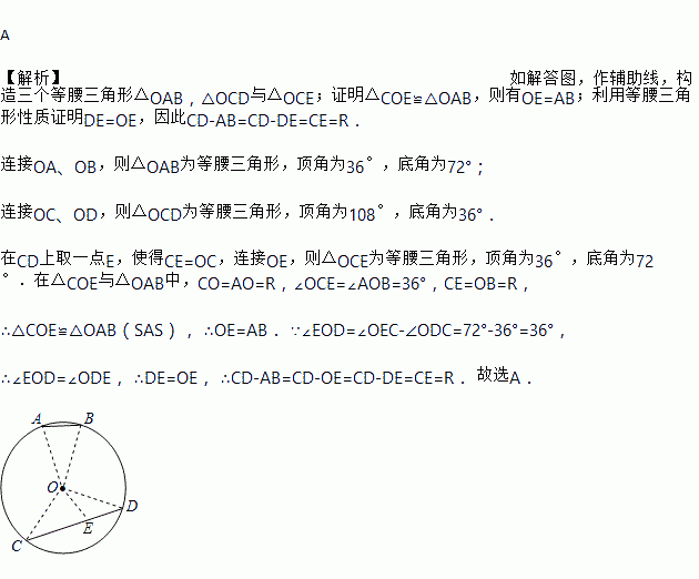 如图,在半径为R的⊙O中,和度数分别为36°和108°,弦CD与弦AB长度的差为(用含有R的代数式表示).