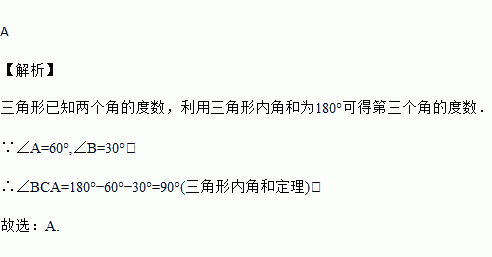 如图,一面小红旗,其中∠A=60°,∠B=30°,则∠BCA=90°.求解的直接依据是( )