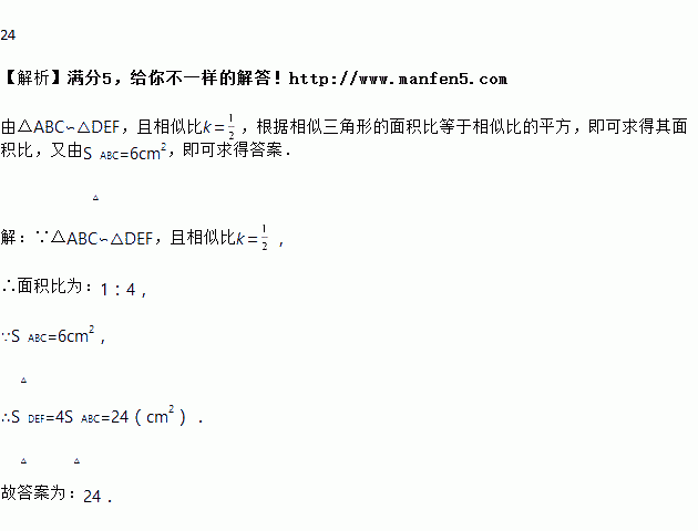 若△ABC∽△DEF,且相似比k=,当S△ABC=6 cm2时,则S△DEF=________ cm2.
