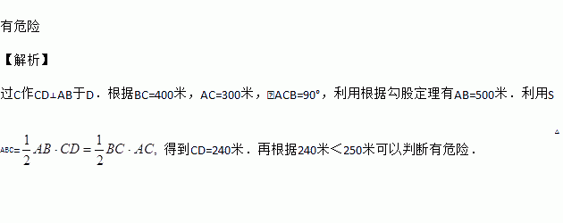 在甲村至乙村的公路旁有一块山地正在开发,现有一C处需要爆破,已知点C与公路上的停靠站A的距离为300米,与公路上另一停靠站B的距离为400米,且CA⊥CB,如图,为了安全起见,爆破点C周围半径250米范围内不得进入,问在进行爆破时,公路AB段是否有危险,是否而需要暂时封锁?请通过计算进行说明.