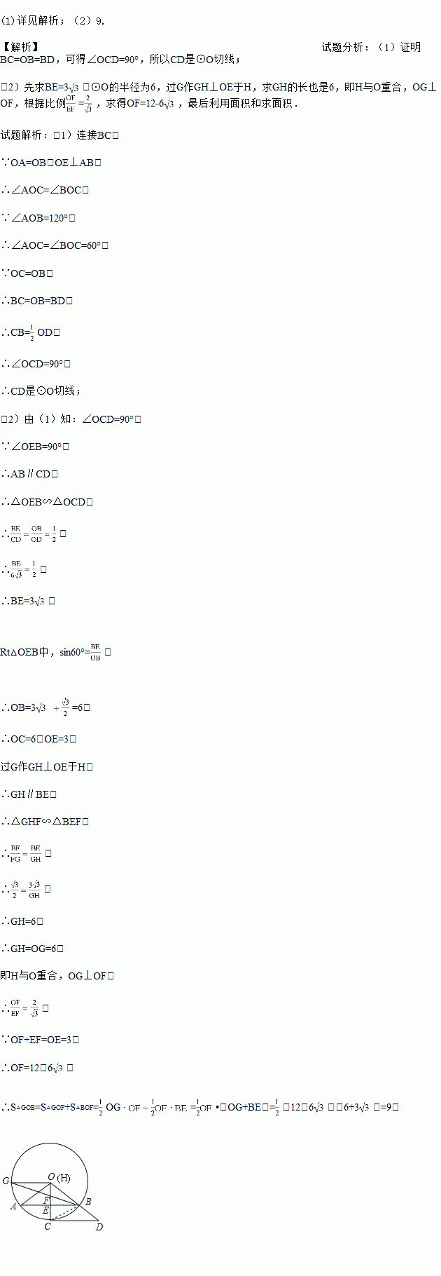△OAB是⊙O的内接三角形,∠AOB=120°,过O作OE⊥AB于点E,交⊙O于点C,延长OB至点D,使OB=BD,连CD.