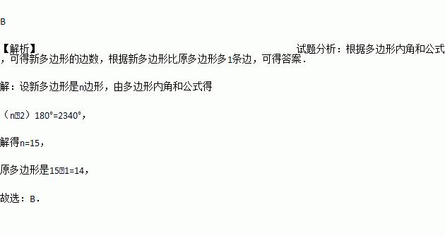 如图,一个多边形纸片按图示的剪法剪去一个内角后,得到一个内角和为2340°的新多边形,则原多边形的边数为( )