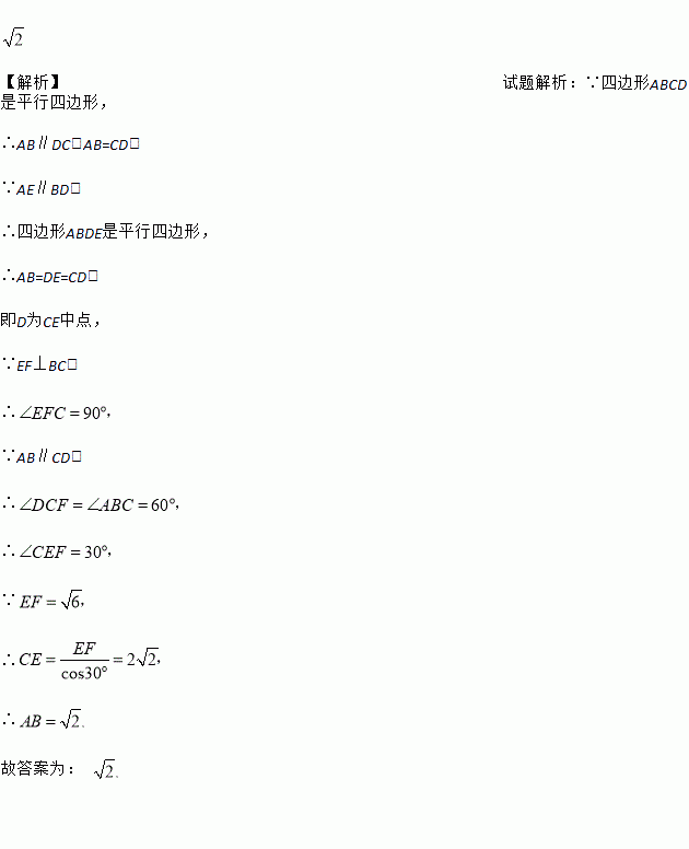 如图,平行四边形ABCD中,∠ABC=60°,E,F分别在CD和BC的延长线上,AE∥BD,EF⊥BC,EF=,则AB的长是__________.