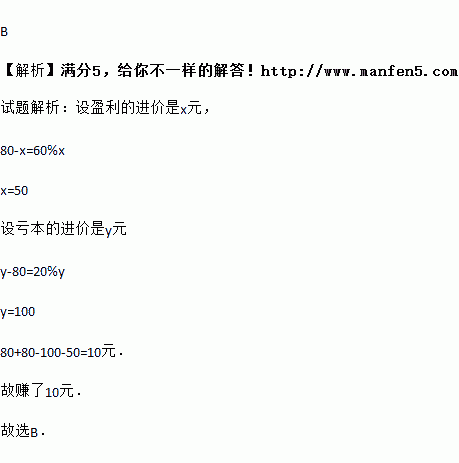 已知某商店有两个进价不同的计算器都卖了80元,其中一个盈利60%,另一个亏损20%,在这次买卖中,这家商店( )