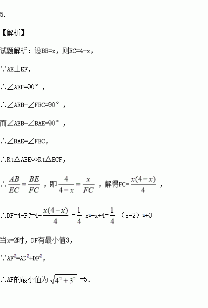 如图,正方形ABCD的边长为4,E、F分别是BC、CD上的两个动点,且AE⊥EF.则AF的最小值是 .