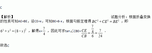 直角三角形纸片的两直角边长分别为6,8,现将△ABC如图那样折叠,使点A与点B重合,折痕为DE,则tan∠CBE的值是( )