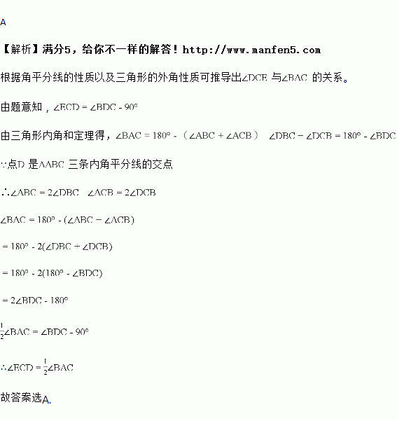 已知:如图,三条内角平分线交于点D,CE⊥BD交BD的延长线于E,则∠DCE=( )