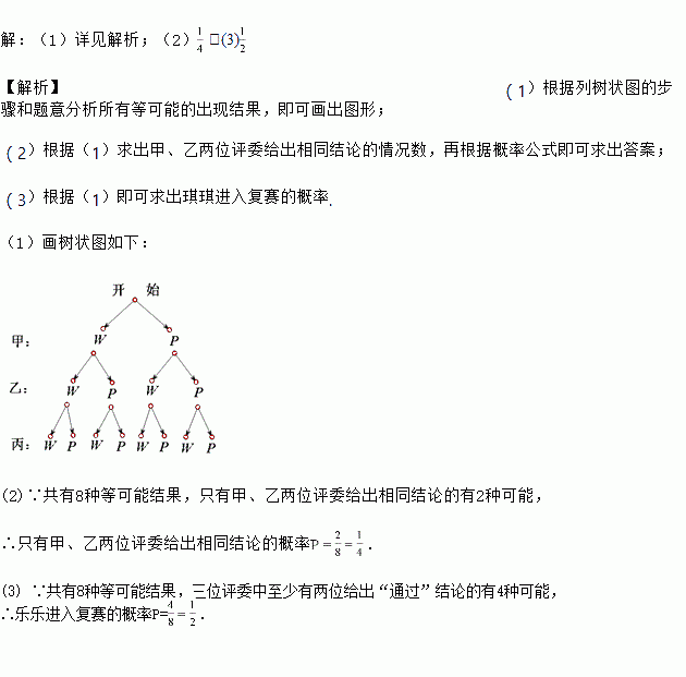 在某小学“演讲大赛”选拔赛初赛中,甲、乙、丙三位评委对小选手的综合表现,分别给出“待定”(用字母W表示)或“通过”(用字母P表示)的结论.