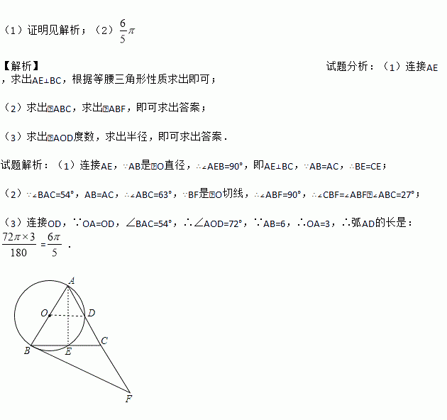 如图,在△ABC中,AB=AC,∠BAC=54°,以AB为直径的 ⊙O分别交AC,BC于点D,E,过点B作⊙O的切线,交AC的延长线于点F.