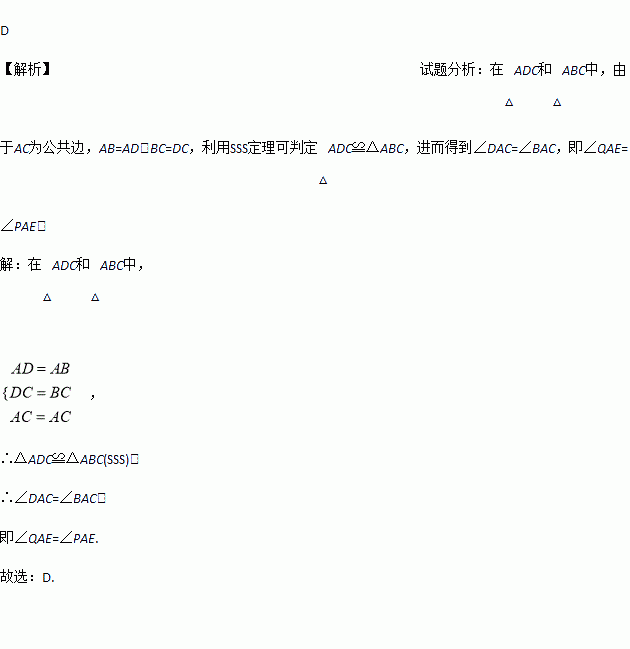 如图,小明做了一个角平分仪ABCD,其中AB=AD,BC=DC.将仪器上的点A与∠PRQ的顶点R重合,调整AB和AD,使它们分别落在角的两边上,过点A,C画一条射线AE,AE就是∠PRQ的平分线.此角平分仪的画图原理是:根据仪器结构,可得△ABC≌△ADC,这样就有∠QAE=∠PAE.则说明这两个三角形全等的依据是( )