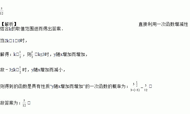 已知函数y=(2k﹣1)x+4(k为常数),若从﹣3≤k≤3中任取k值,则得到的函数是具有性质“y随x增加而增加”的一次函数的概率为_____.