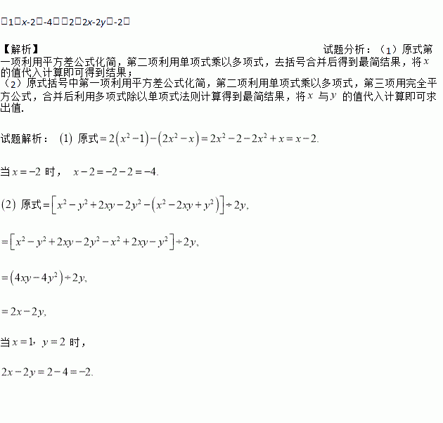 (1)x-2;-4;(2)2x-2y,-2. 【解析】试题分析:(1)原式第一项利用平方差公式化简,第二项利用单项式乘以多项式,去括号合并后得到最简结果,将的值代入计算即可得到结果; (2)原式括号中第一项利用平方差公式化简,第二项利用单项式乘以多项式,第三项用完全平方公式,合并后利用多项式除以单项式法则计算得到最简结果,将与的值代入计算即可求出值. 试题解析: 原式 当时, ...