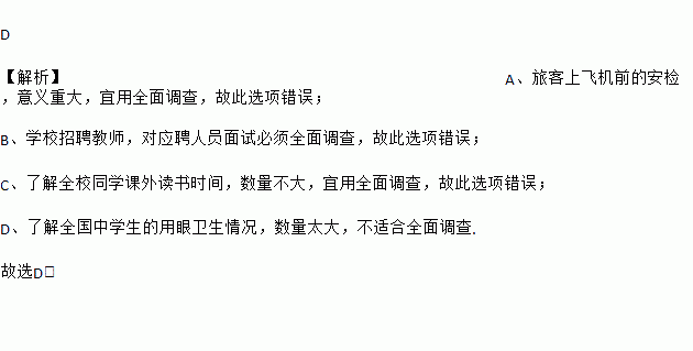 C. 了解全校学生的课外读书时间 D. 了解全国中学生的用眼卫生情况