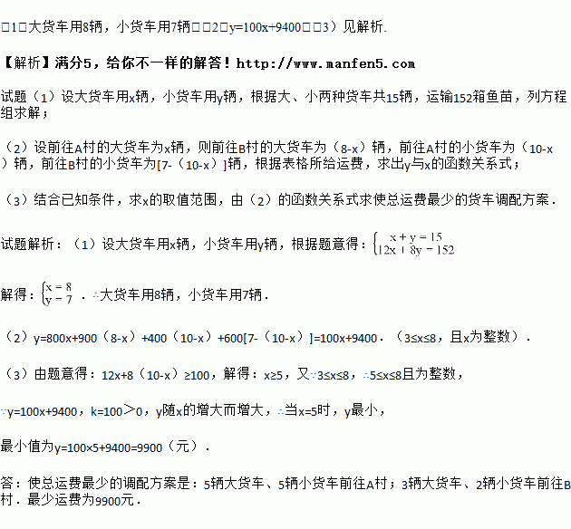 为了贯彻落实市委政府提出的“精准扶贫”精神,某校特制定了一系列帮扶A、B两贫困村的计划,现决定从某地运送152箱鱼苗到A、B两村养殖,若用大小货车共15辆,则恰好能一次性运完这批鱼苗,已知这两种大小货车的载货能力分别为12箱/辆和8箱/辆,其运往A、B两村的运费如表: