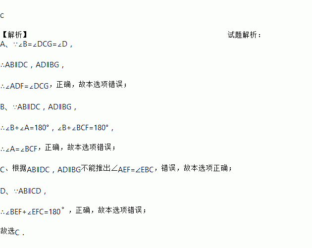如图,点E,F分别是AB,CD上的点,点G是BC的延长线上一点,且∠B=∠DCG=∠D,则下列判断中,错误的是( )