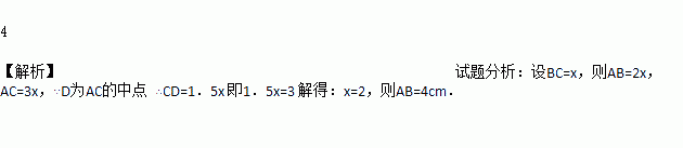 如图,BC=AB,D为AC的中点,DC=3cm,则AB的长是______.